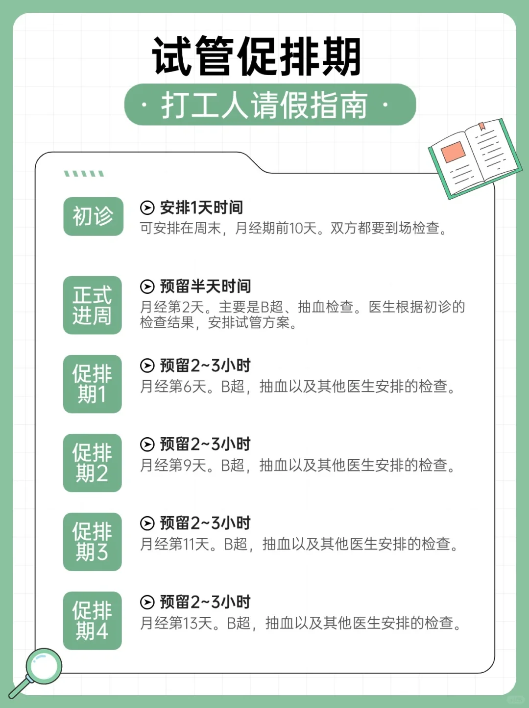 一份详尽的试管婴儿促排周期返院时间表,为计划通过辅助生殖实现生育梦想的职场人士提供实用参考。了解从初诊到取卵的各阶段所需时长,助您合理安排请假,高效完成助孕流程。按照我的个人流程,分享一下试管【促排】期间的时间安排。对于考虑代生或代怀的家庭来说,了解这一流程尤为重要。以下为返院时间表,打工人可参考作...